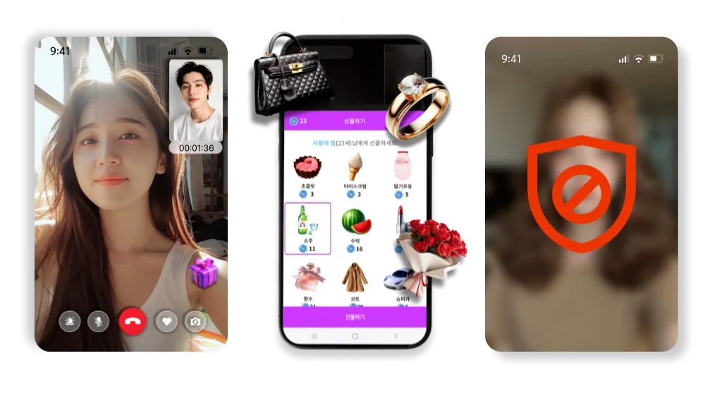 영상통화 중에 다양한 아이템들을 선물로 받을 수 있으며, 받은 선물은 캐시로 전환하여 현금으로 환급받으실 수 있어요