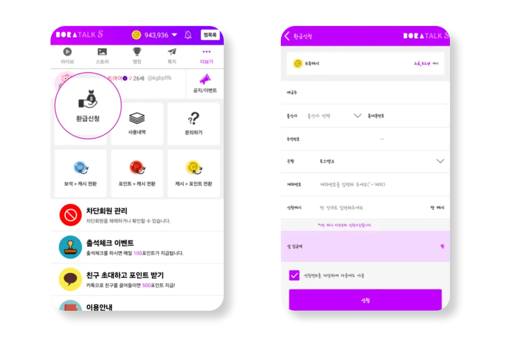 영상통화로 적립한 캐시와 게시물 판매, 선물받기 등으로 적립된 보석은 캐시로 전환 후 환급 신청하면 현금으로 입금받을 수 있어요