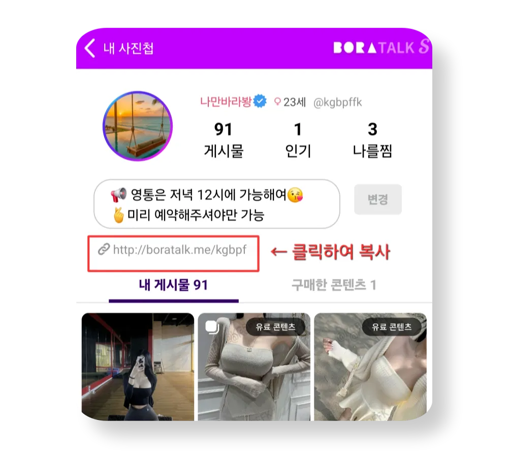 내 사진첩 프로필 링크를 복사해 다양한 외부 SNS 등에서 홍보할 수 있어요 (링크를 클릭하면 복사 완료)