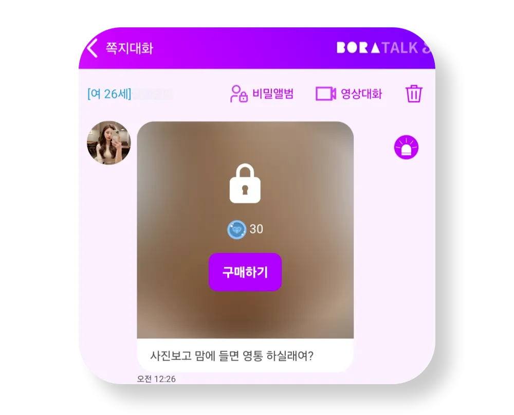 *유료 게시물 전송 시 상대가 구매하기 전에는 상대쪽 화면과 비밀앨범에서는 이렇게 블라인드 처리되어 보여지니 안심하셔도 돼요