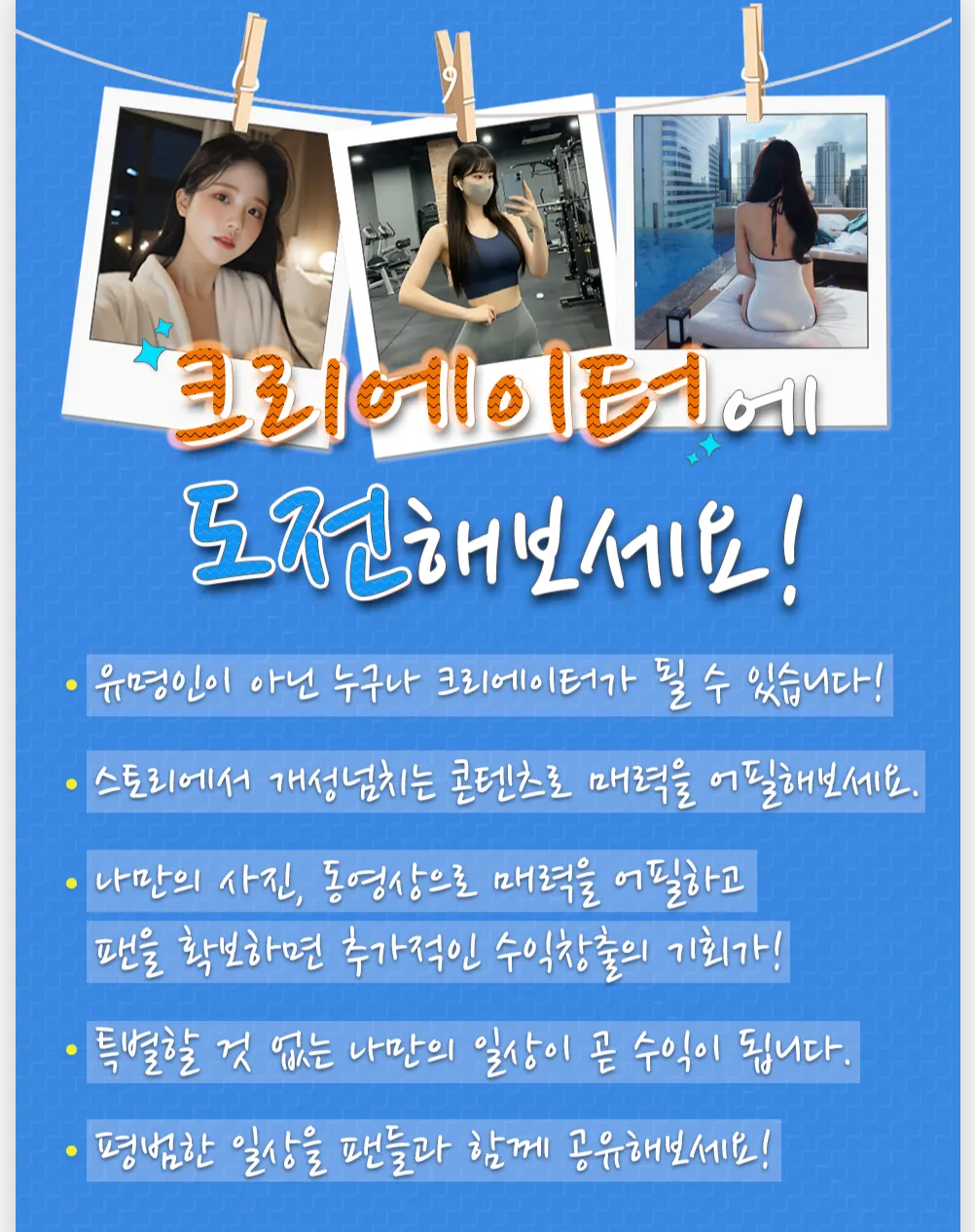 크리에이터가 된다면 누구나 영상통화, 콘텐츠 판매, 선물받기로 다양하게 수익 창출이 가능합니다.